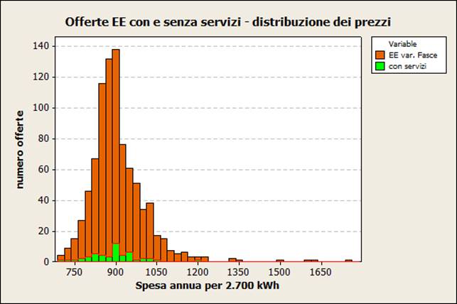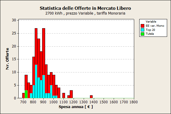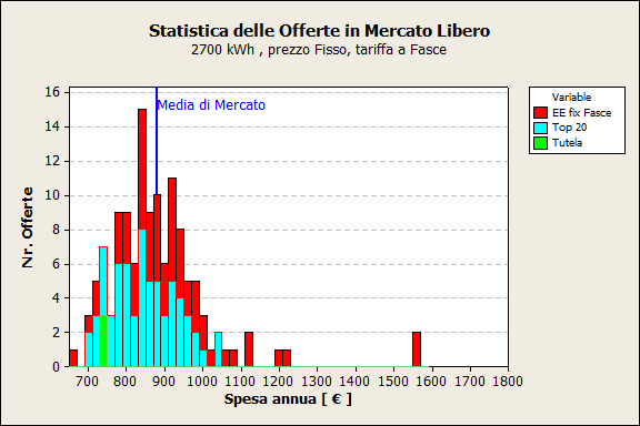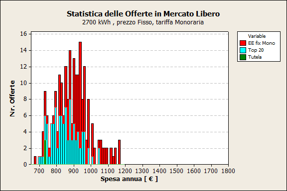 Distribuzione delle offerte per spesa annua : Mercato Libero, Energia 2.700kWh (prezzo fisso, tariffa monoraria).