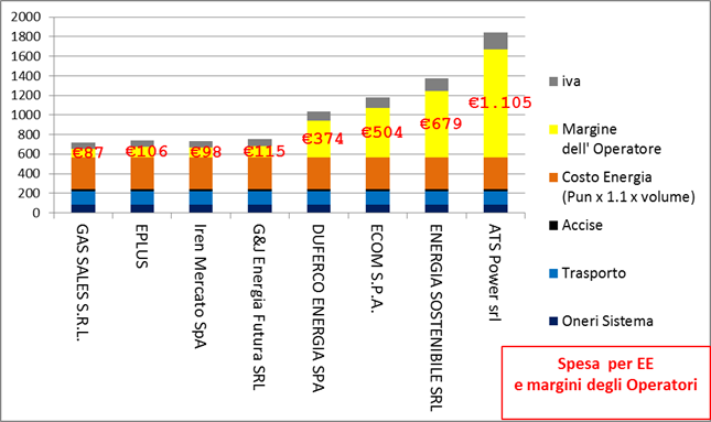 La spesa che gli utenti sostengono è destinata a compensare costi comuni e uguali per tutti (Costo dell’energia all’ingrosso, Trasporto, Oneri, Accise ) ed a retribuire il servizio del fornitore. Qui le differenze sono significative, poiché il margine che l’operatore applica al servizio (area gialla) varia da un minimo di 87 euro ad un massimo di 1.105 euro (fornitore meno economico). La differenza è straordinaria per questo servizio-prodotto standardizzato, tenendo conto che le offerte presentate nel grafico NON contengono servizi a valore aggiunto.