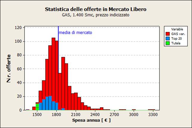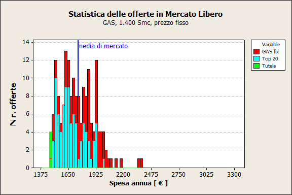 Distribuzione delle offerte per spesa annua : Mercato Libero, Gas 1.400 Smc (prezzo
